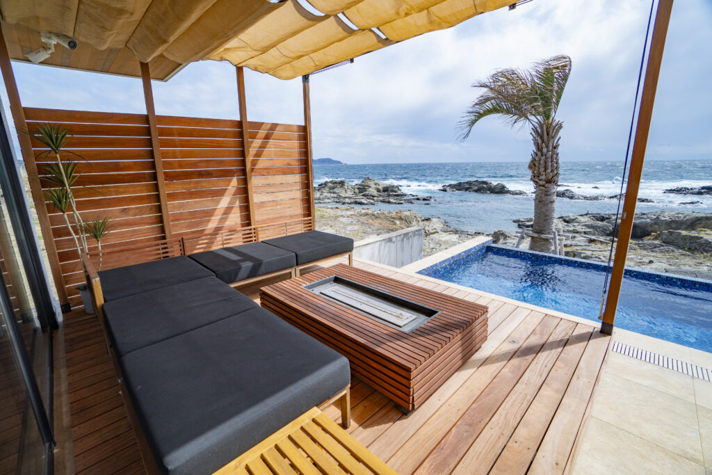 屋外用のソファと屋根付きのカバナがプールサイドにございます。海を眺めながらゆっくりと楽しめるスペースとなっております。